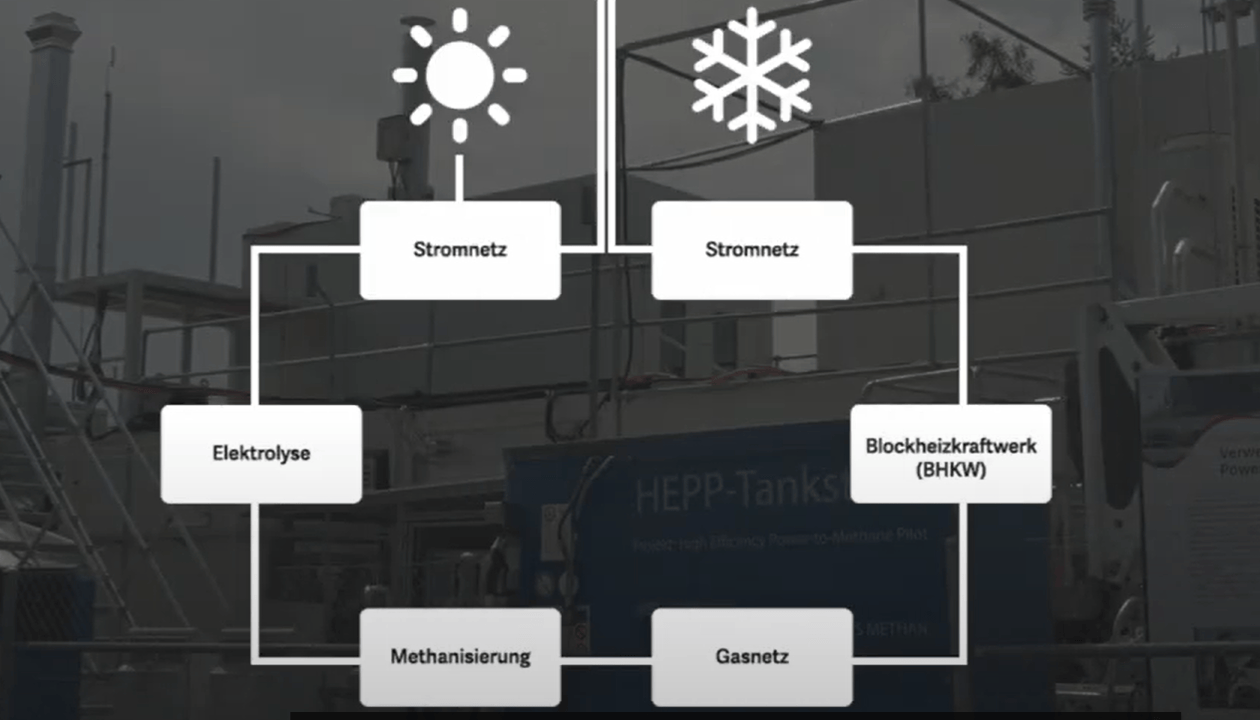 So soll der Kreislauf geschlossen werden: von der Stromproduktion im Sommer, die Umwandlung in Wasserstoff mit Elektrolyse, weiter in Methan mit Methanisierung und dann wieder die Rückverstromung im Winter und die gleichzeitige Wärmeproduktion, die man für Wärmenetze und für Haushalte nutzen kann.