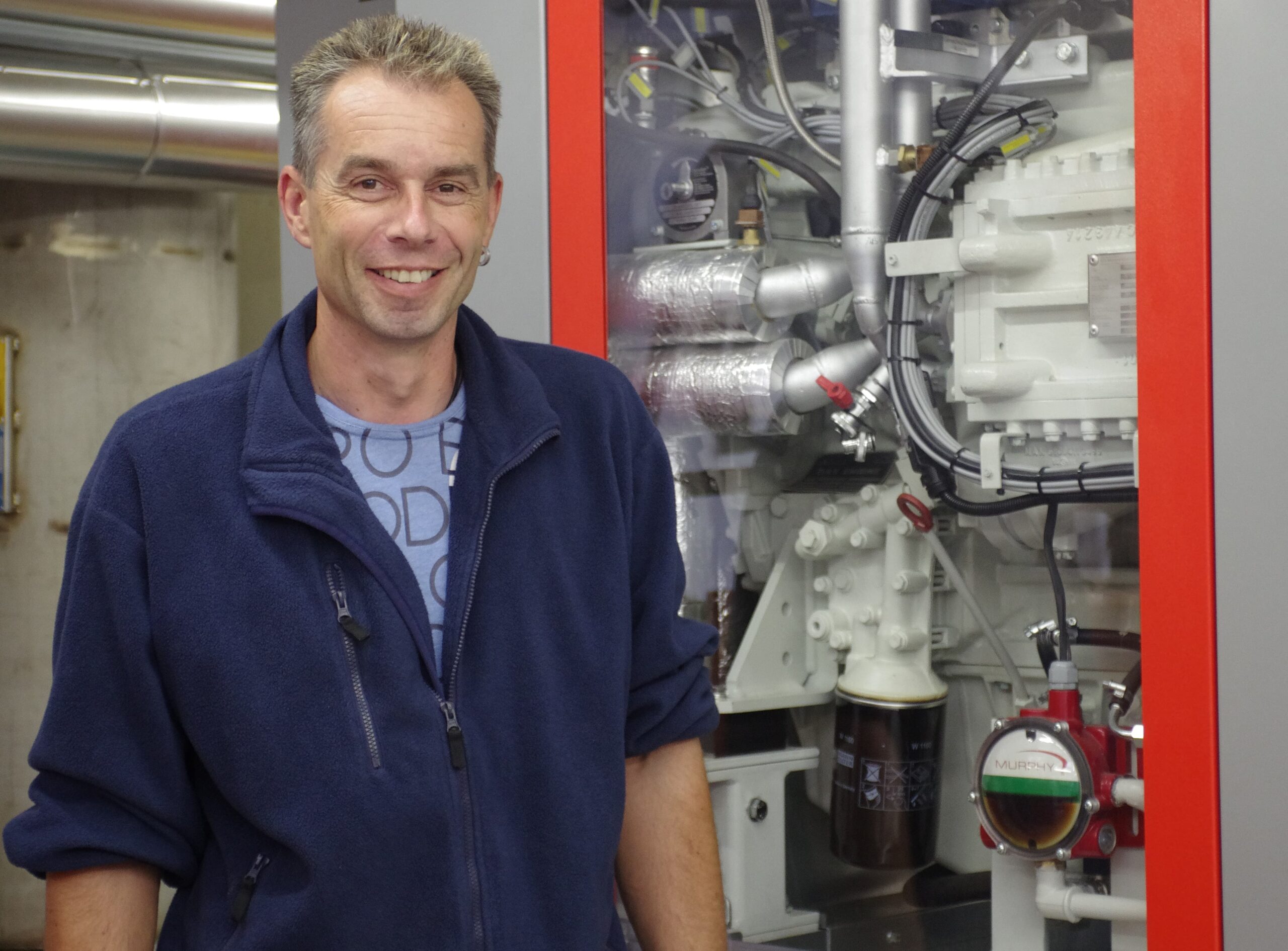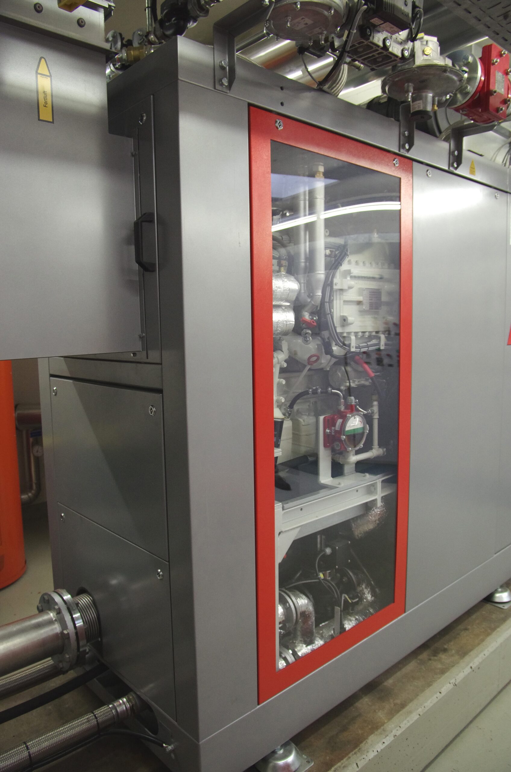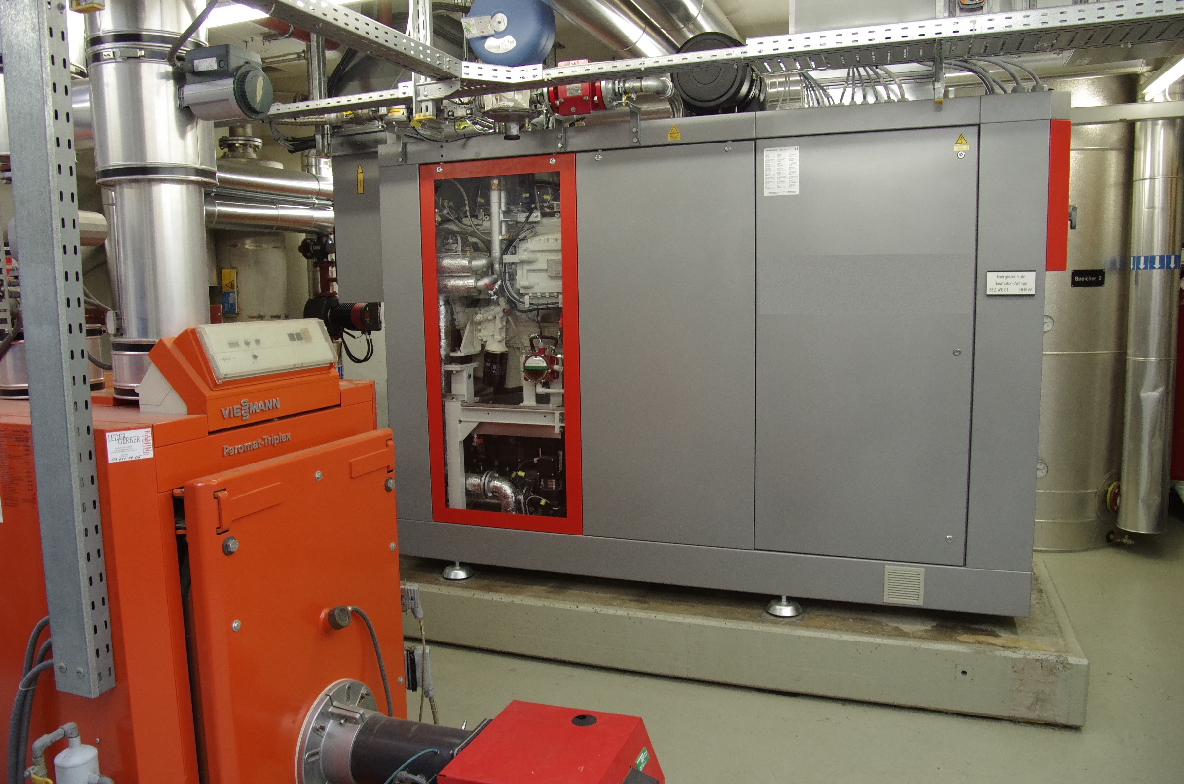 Peter Huber bestätigt: „Die Evaluation des BHKW durch ein Planungsbüro berücksichtigte die funktionalen, ökonomischen und zukunftsgerichteten Aspekte. Stets gilt es, den Eigenverbrauch der Stromproduktion zu optimieren, bei gleichzeitiger Versorgung mit genügend Wärme.“ Das BHKW liefert eine Temperatur von 95 °C. Damit werden die zwei Wärmespeicher mit je 2’000 Liter Inhalt auf 85 °C aufgeheizt. Im Faulturm benötigt man noch ca. 40 °C für einen einwandfreien Verfahrensablauf. Die neue Anlagensteuerung berücksichtigt dabei die Klärgasspeicherung, so dass mehr Gasvolumen für die Stromproduktion während Hochtarifzeiten zur Verfügung steht. Bei der Installation des neuen BHKW wurde auch ein Aktivkohlefilter und neue Aussenkühlwerke installiert. Die gesamte Umbauphase war in anderthalb Wochen abgeschlossen. Für Zeiten ohne eigene Gasproduktion steht zusätzlich noch ein Heizkessel mit wahlweise Öl- oder Gasbrenner zur Verfügung.